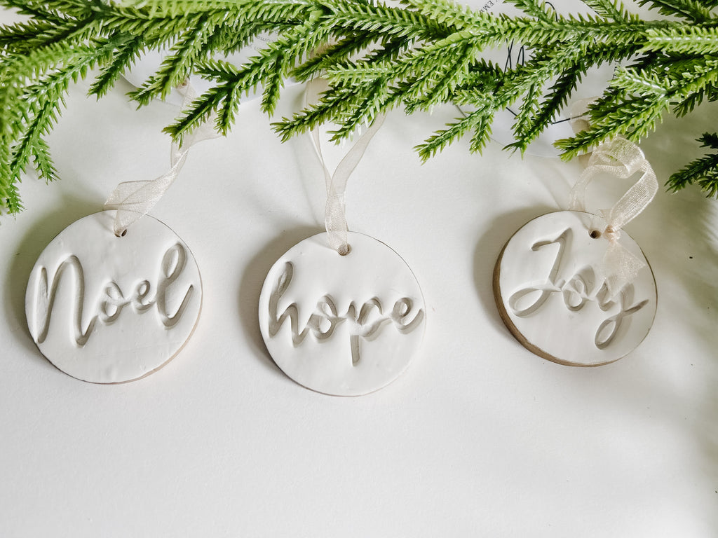 Handmade by survivor-artisans, the Hope, Joy and Noel Collection is a set of three stamped polymer clay ornaments with a golden edge, finished with a gold organa ribbon. Handcrafted by a survivor of human trafficking, this exclusive piece encourages healing and restoration at The WellHouse.