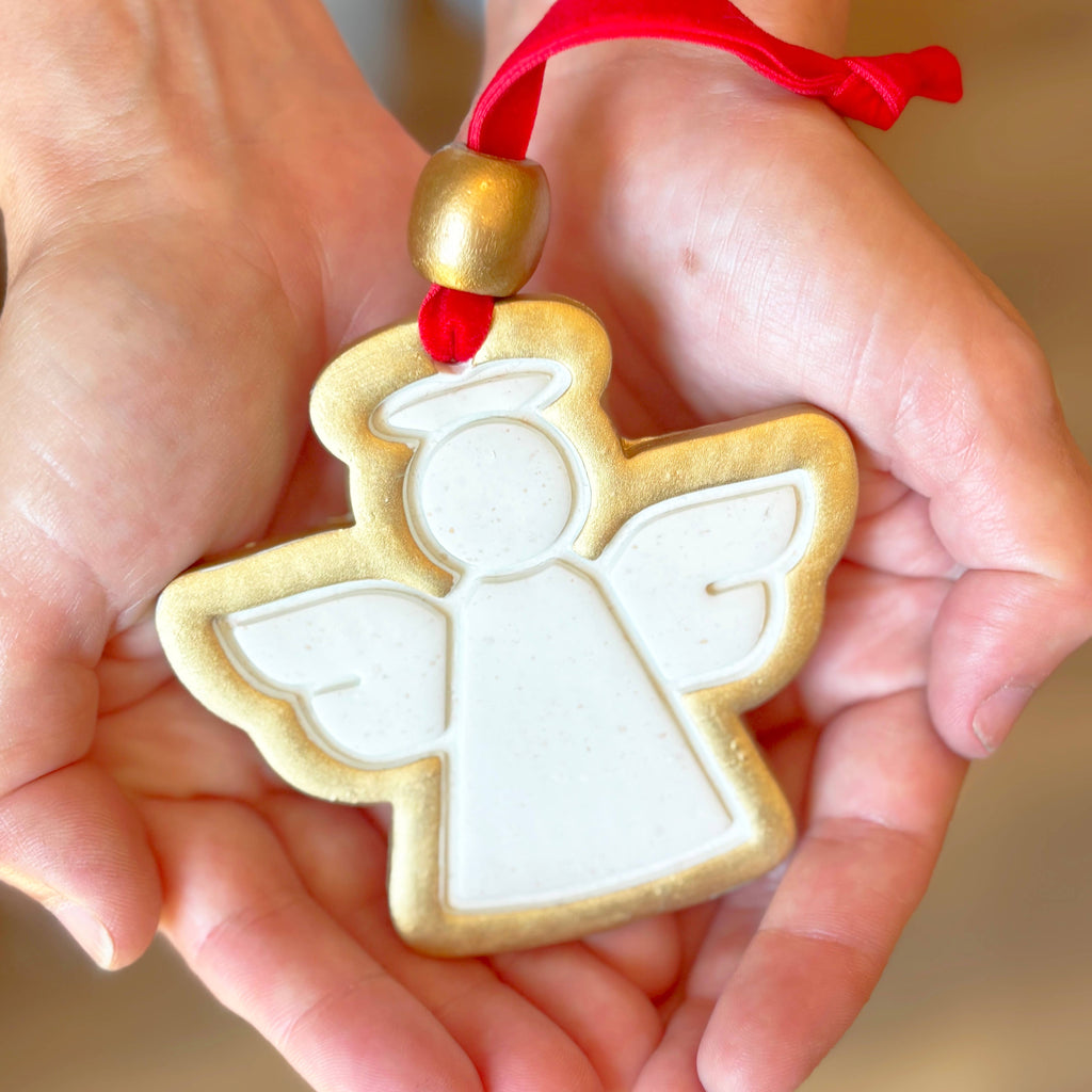 Nancy Angel Ornament: Golden Edge with Red Ribbon