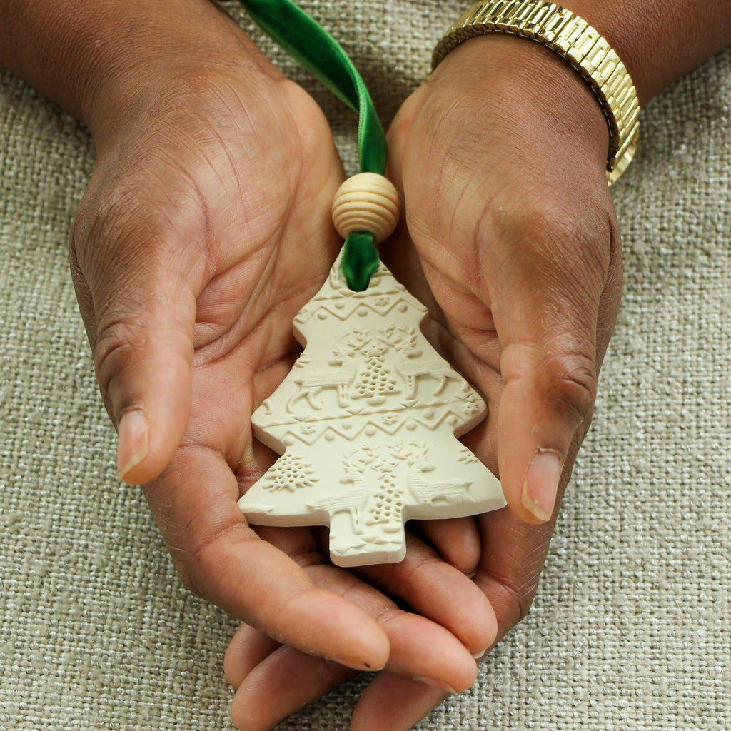 Handmade by survivor-artisans, the Snowy Tree ornament is a white polymer clay ornament, embossed with a Fair Isle style Christmas scene, strung on a green velvet ribbon, and finished with a wooden bead. Handcrafted by a survivor of human trafficking, this exclusive piece encourages healing and restoration at The WellHouse.