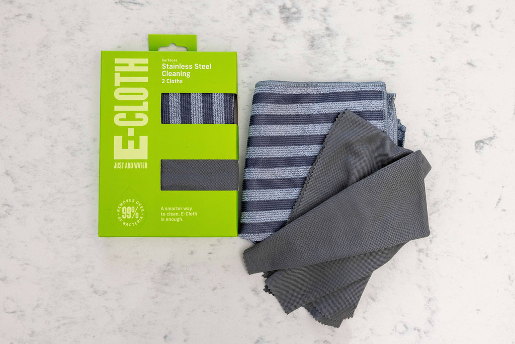 All you need to keep stainless steel looking as good as its name, this E-Cloth pack includes 1 Stainless Steel Cloth and 1 Glass & Polishing Cloth. Masses of premium microfibers harness water's cleaning power to grab grime, fingerprints, and over 99% of bacteria — using just water. There’s no need for messy pastes, single-use wipes, or sprays that could linger in the air you breathe. The cleaning cloth has two sides — striped for brushed stainless steel and solid for polished stainless steel. Just dampen and wipe. Then follow with the Glass & Polishing Cloth to absorb moisture, water spots, and streaks, restoring a like-new finish with just a few swipes. Rinse cloths between uses. Toss in the laundry — not a landfill — to refresh. Guaranteed to last for 1 year or 100 washes, the E-Cloth Stainless Steel Cleaning Pack helps you cross paper towels and additional cleaners off your shopping list for good.
